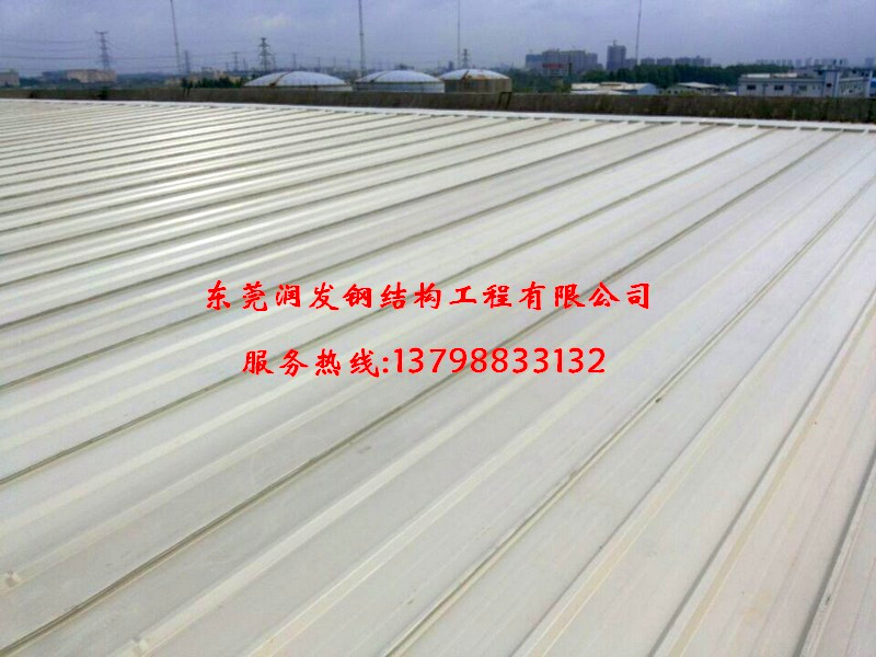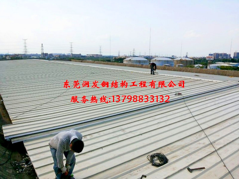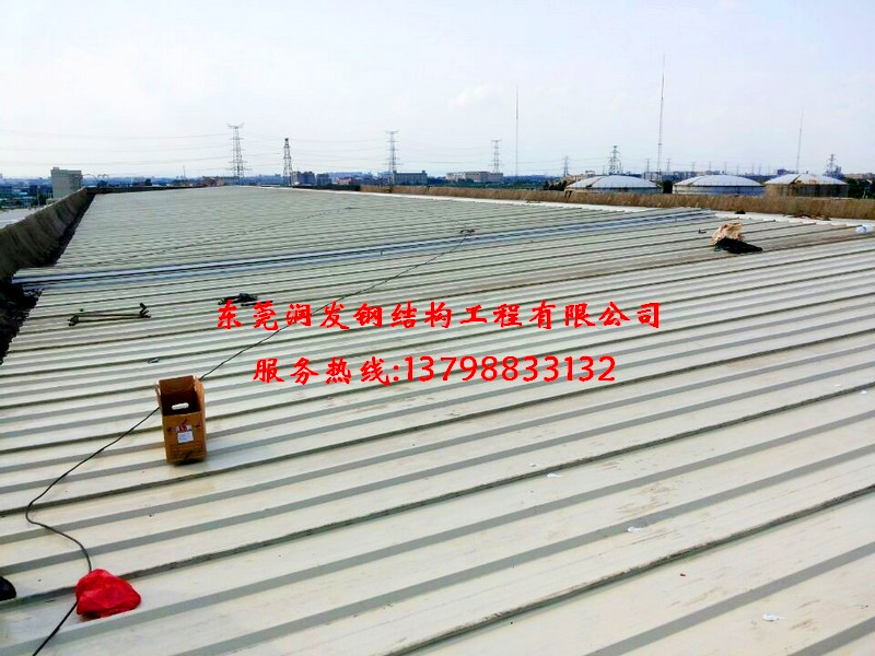 本工程為:東莞厚街電力有限公司,原有發(fā)電房鋼結(jié)構(gòu)屋面板更換工程實例,總面積為3000平方米,原有舊板更換為0.426厚+10kgEPS(850型單面隔熱暗扣板,與原有水池改建為臨時倉庫工程.