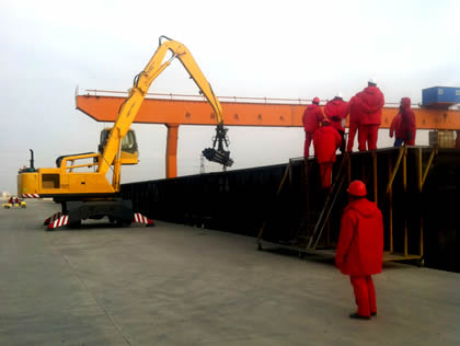 圖中所示:該抓管機(jī)正在進(jìn)行鋼管的卸火車(chē)作業(yè),卸火車(chē)裝汽車(chē)一次完成!鋼管由于太長(zhǎng),抓取時(shí)重心不太好掌握,我公司專門(mén)為其設(shè)計(jì)了專用抓具,便于抓取時(shí)掌握鋼管的重心,大大提高了鋼管的裝卸效率,受到了客戶的稱贊。